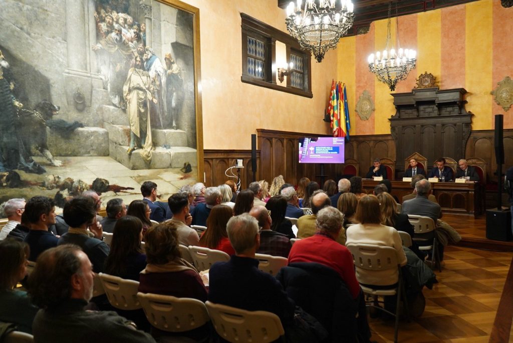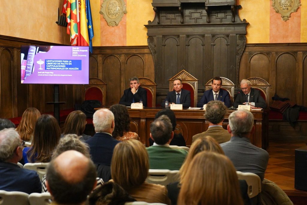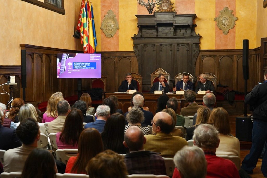 El XXXIV Foro de Derecho Aragonés ha llegado a su fin con aforo completo en el Salón del Justicia del Ayuntamiento de Huesca, que se ha quedado pequeño para acoger la jornada titulada ‘Limitaciones para la libertad de pacto en capitulaciones matrimoniales en Aragón’.
